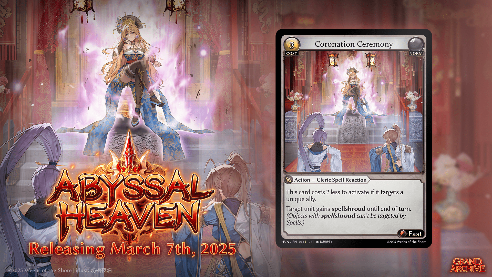 Additionally, to celebrate the release of Abyssal Heaven, we’re offering an exclusive promotional card, "Coronation Ceremony", featuring unique artwork, with text effects in Traditional Chinese. This promotional card will be available in foil at the Grand Archive booth and non-foil at the Limnos booth, with details on how to receive it to be determined.