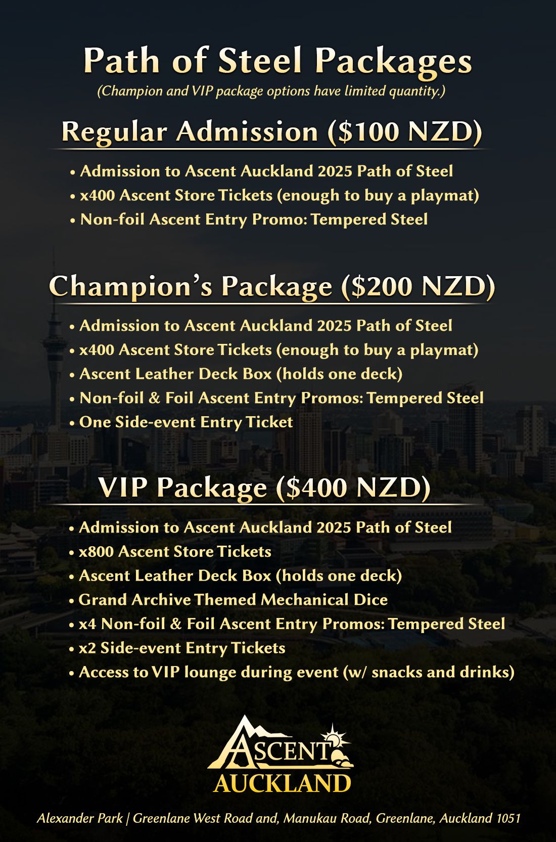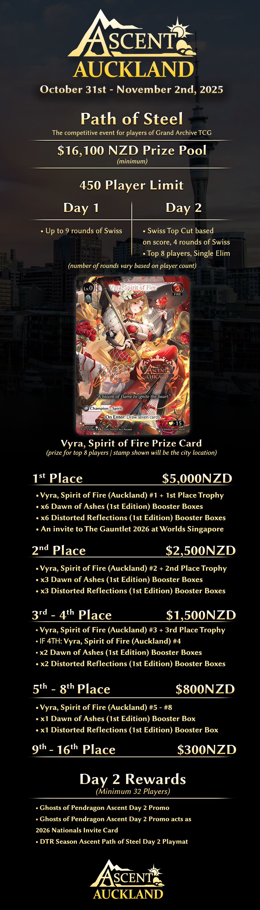 Ascent is headed back to New Zealand for it's 2nd event in Auckland! This event will only feature the Path of Steel, the competitive Grand Archive event for players with a minimum prize pool of $10,000 USD ($16,100 NZD) up for grabs, or $15,000 USD at 256+ players. However, there will be plenty of side events and after-hour festivities for the community.