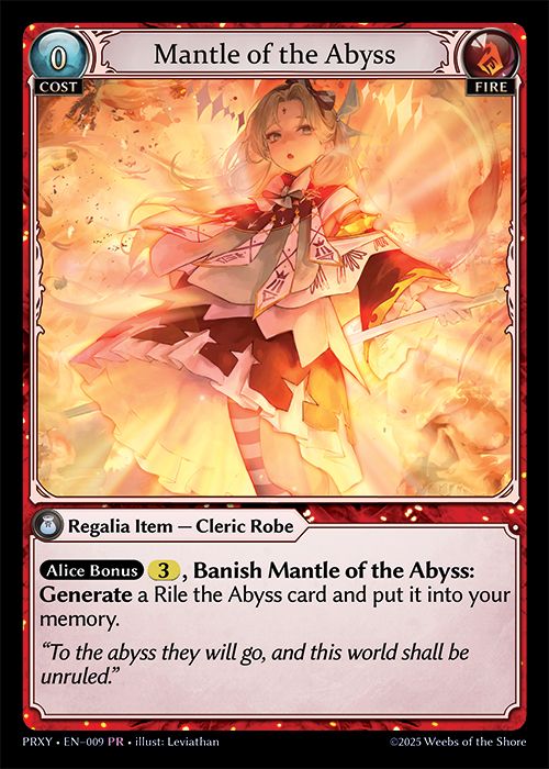 Rile the Abyss was a card that shook up Grand Archive meta disproportionately from the more limited niche we had designed the card for. The balance of the card designed with Fire Alice Specter archetypes in mind. As a result, we are trying to explore a more limited scope of the card specifically for the archetype by giving Alice decks access to Rile. While Rile the Abyss is itself banned from play, this only limits the card from its inclusion in decklists within tournament formats, but not from being played in a match if it were to be generated into the game. We hope that this will allow Alice decks to be explored more within their original scope of design and will expectantly look at the meta shifts with the launch of Phantom Monarchs today.