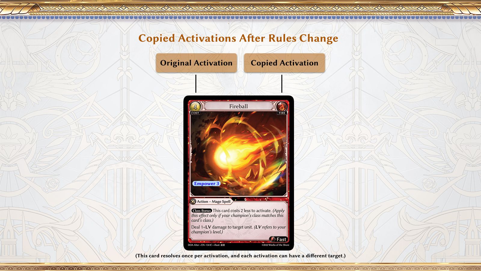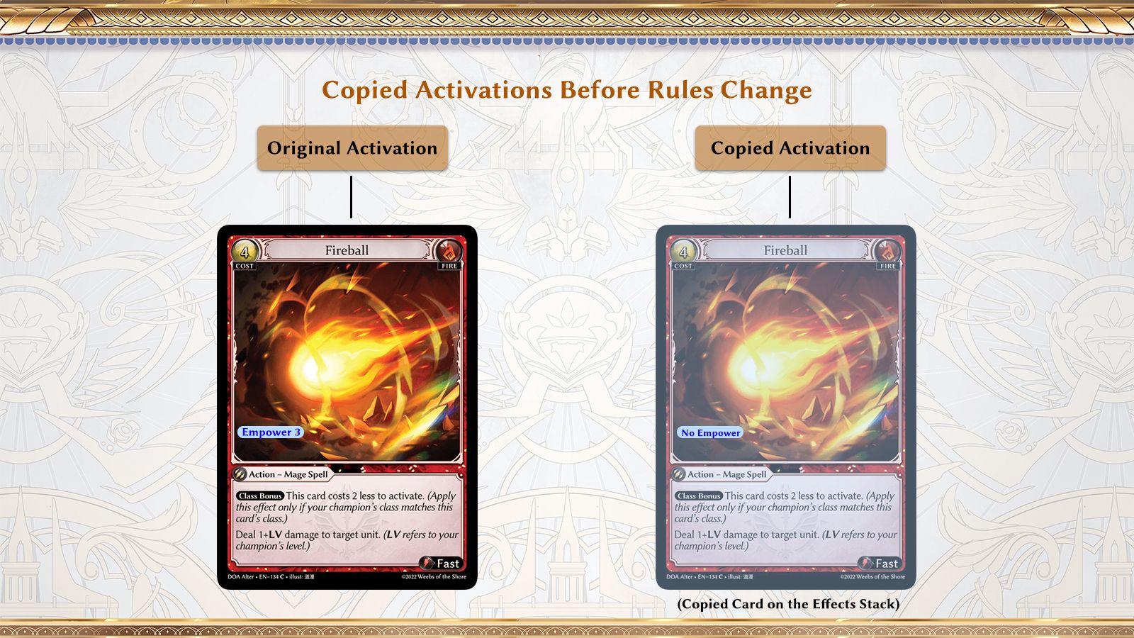 Before, whenever a player is instructed to copy a card activation on the effects stack, that player would create a copy of the card on the effects stack, as well as an associated activation tied to it. The copy of the card on the effects stack would also copy certain properties such as imbued and remember what costs were paid for the original copy. This is inconsistent with how copies work in other aspects of the game such as the field, where a copied object would not retain properties such as awake/rested, imbued, counters, etc. In addition, a copied card on the effects stack would not retain properties enabled by the specific player, such as empower, and restricted abilities unlocked by the original activating player.